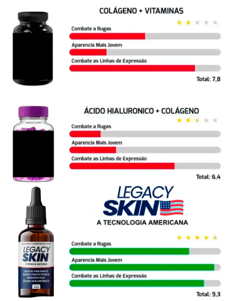 Fizemos testes em laboratório com o Legacy Skin para comparar sua eficácia em relação a outros produtos para pele que estão disponíveis no mercado brasileiro. Para isso, analisamos os 15 produtos mas vendidos e verificamos que NENHUM desses produtos contém como base o Silício Orgânico em conjunto com Ácido Pantotênico e Ácido Hialurônico. Eles apresentam apenas colágeno e ácido retinoico como ingrediente principal.
